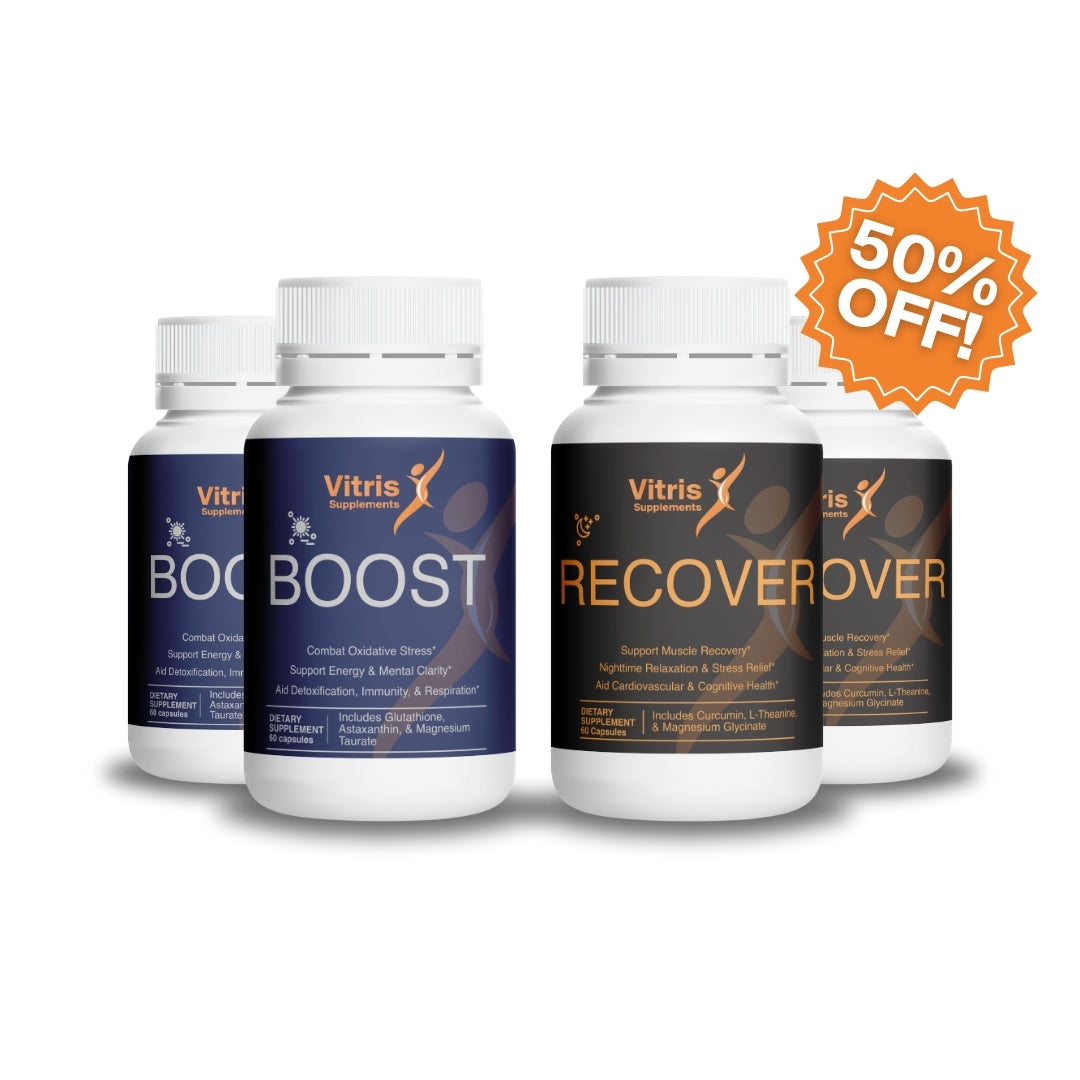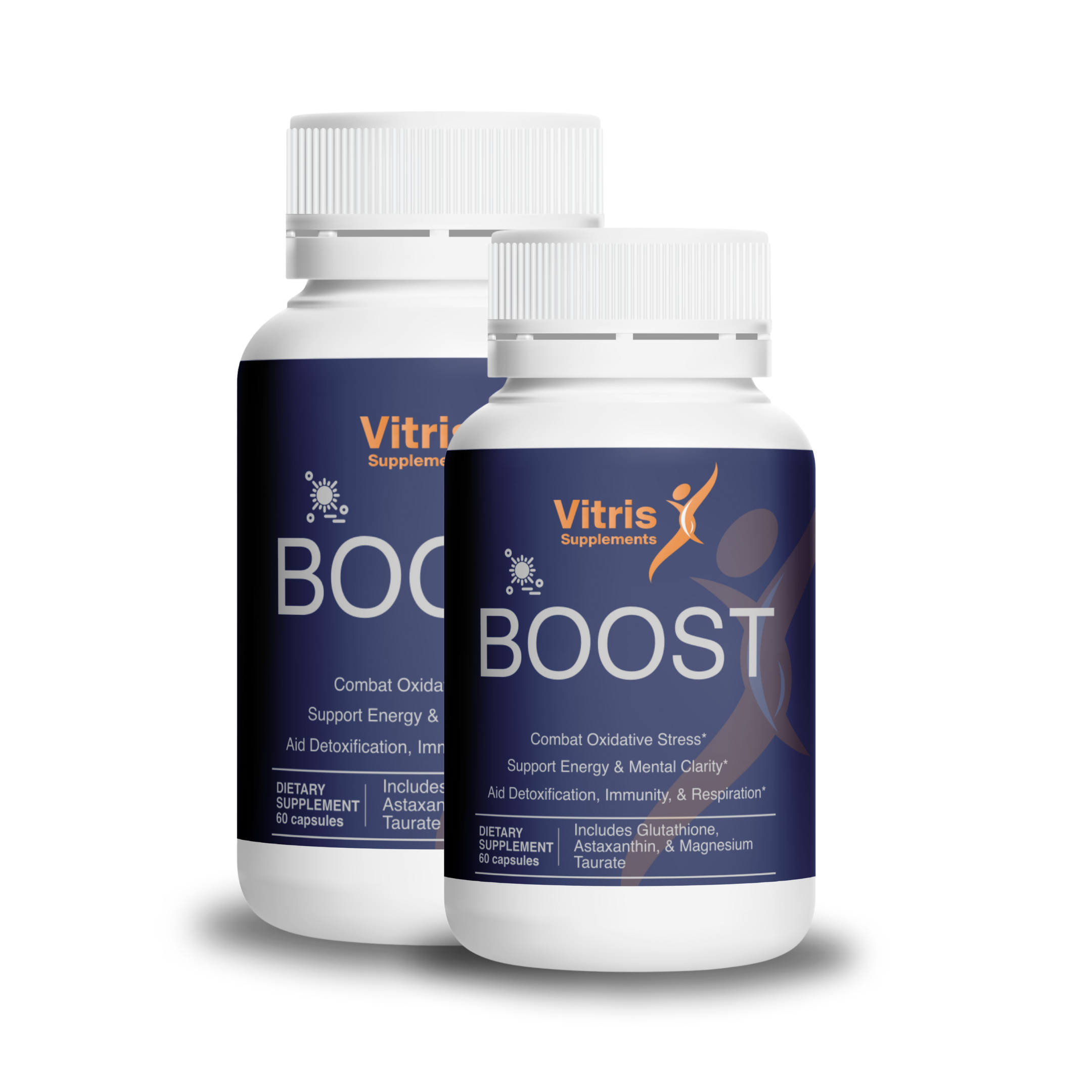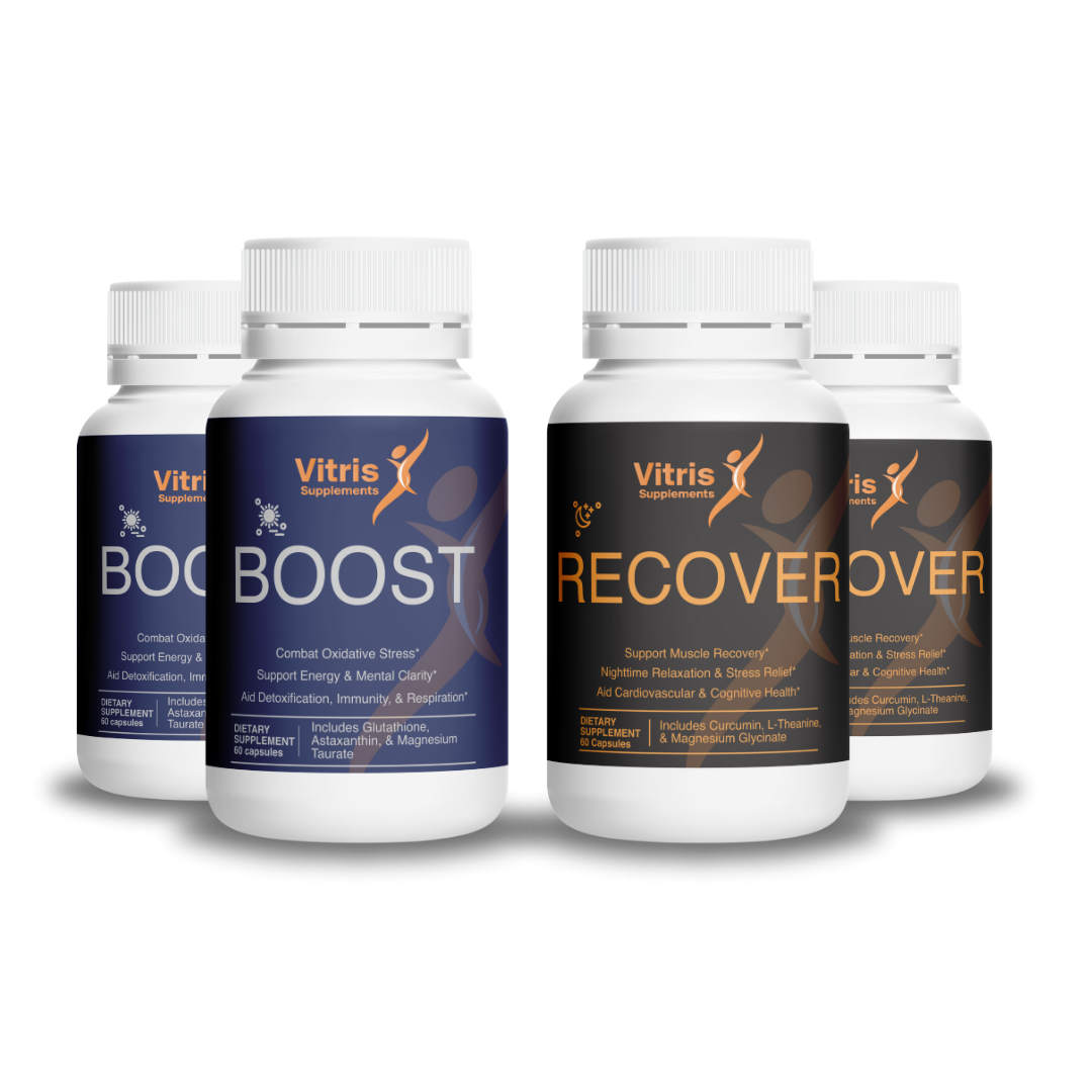 Stressors of the modern world can cause oxidative stress, leading to chronic inflammation and a host of negative health effects. The Big Three antioxidants are the backbone of the Vitris' Vitality Pack, and were chosen for their effectiveness at combatting oxidative stress. Both astaxanthin (Boost) and curcumin (Recover) are relatively difficult to include in the modern diet, making those compounds prime choices for supplementation. Conversely, glutathione is the most abundant antioxidant in the human body, but its reserves can be depleted by factors like age, stress, poor diet, lack of sleep, and even strenuous exercise. The Big Three antioxidants are thus superb candidates for supplementation, that have synergistic effects when taken together.